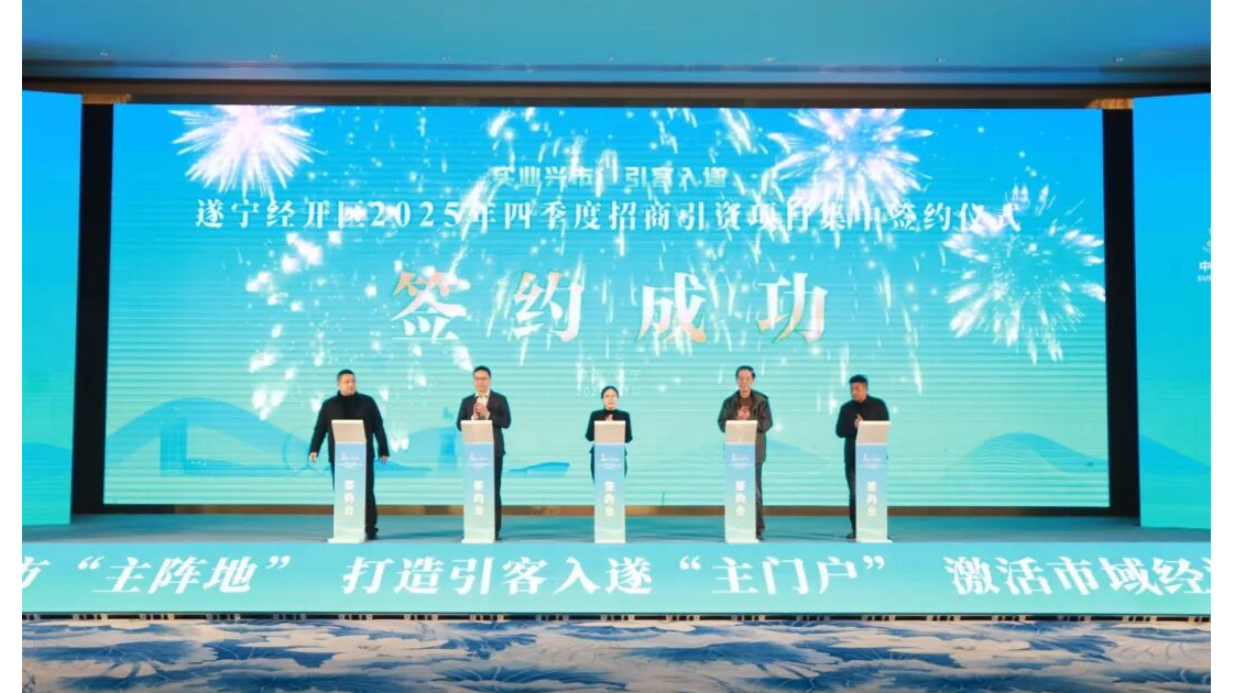 11月20日,遂宁经开区2025年四季度招商引资项目集中签约仪式成功举行。7个重点项目涵盖新能源、电子信息、食品饮料等核心领域,总投资额达95.6亿元,为全市“冲刺四季度、攻坚两千亿”注入强劲动能。市委常委、市政府常务副市长何永宏出席仪式,遂宁经开区党工委书记彭普诚参加仪式并讲话,区党工委副书记、管委会主任谢君环主持签约。作为全市产业发展核心承载地,遂宁经开区以“零碳园区”为统领、以“建圈强链”为